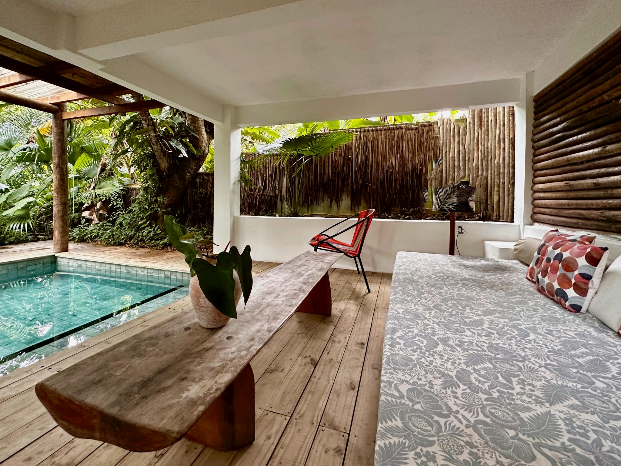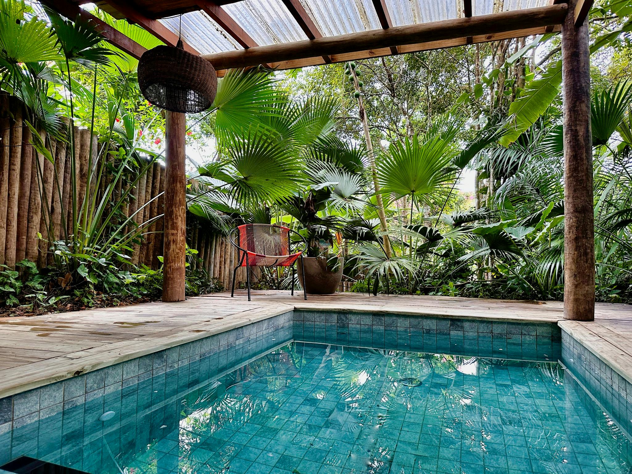 Um bangalô romântico com piscina privativa. 80 metros quadrados. Suspenso com vistas na vegetação tropical no nível superior e com uma piscina privativa exclusiva logo abaixo, convidando a relaxar e se regenerar. Agua aquecida ate 32 gr aprox.