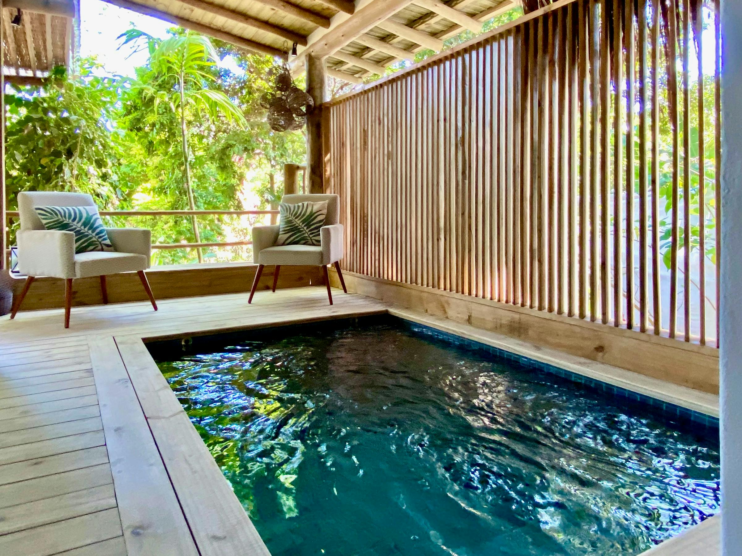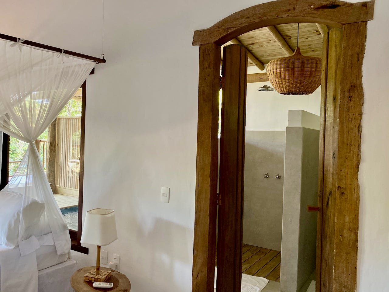 Bangalô amplio e aconchegante, acomoda 3 pessoas. Uma piscina privada ao redor uma varanda suspensa nas arvores. Privacidade, power-shower, TV led a cabo, ar e wi-fi.