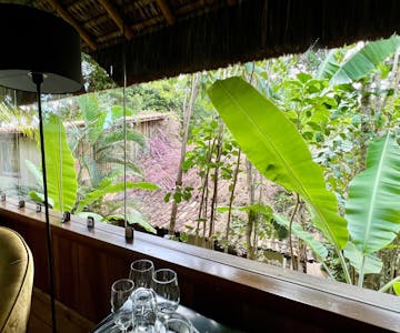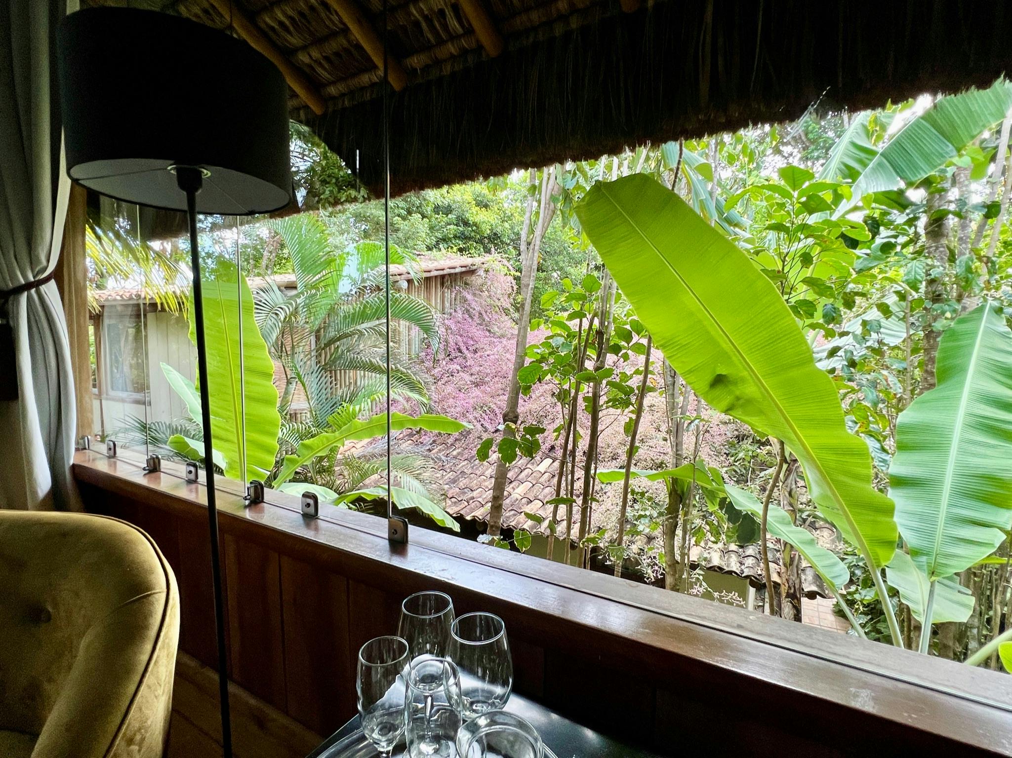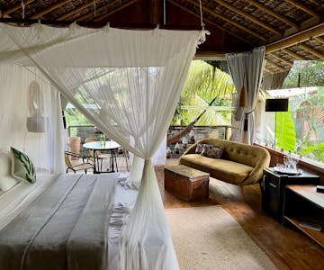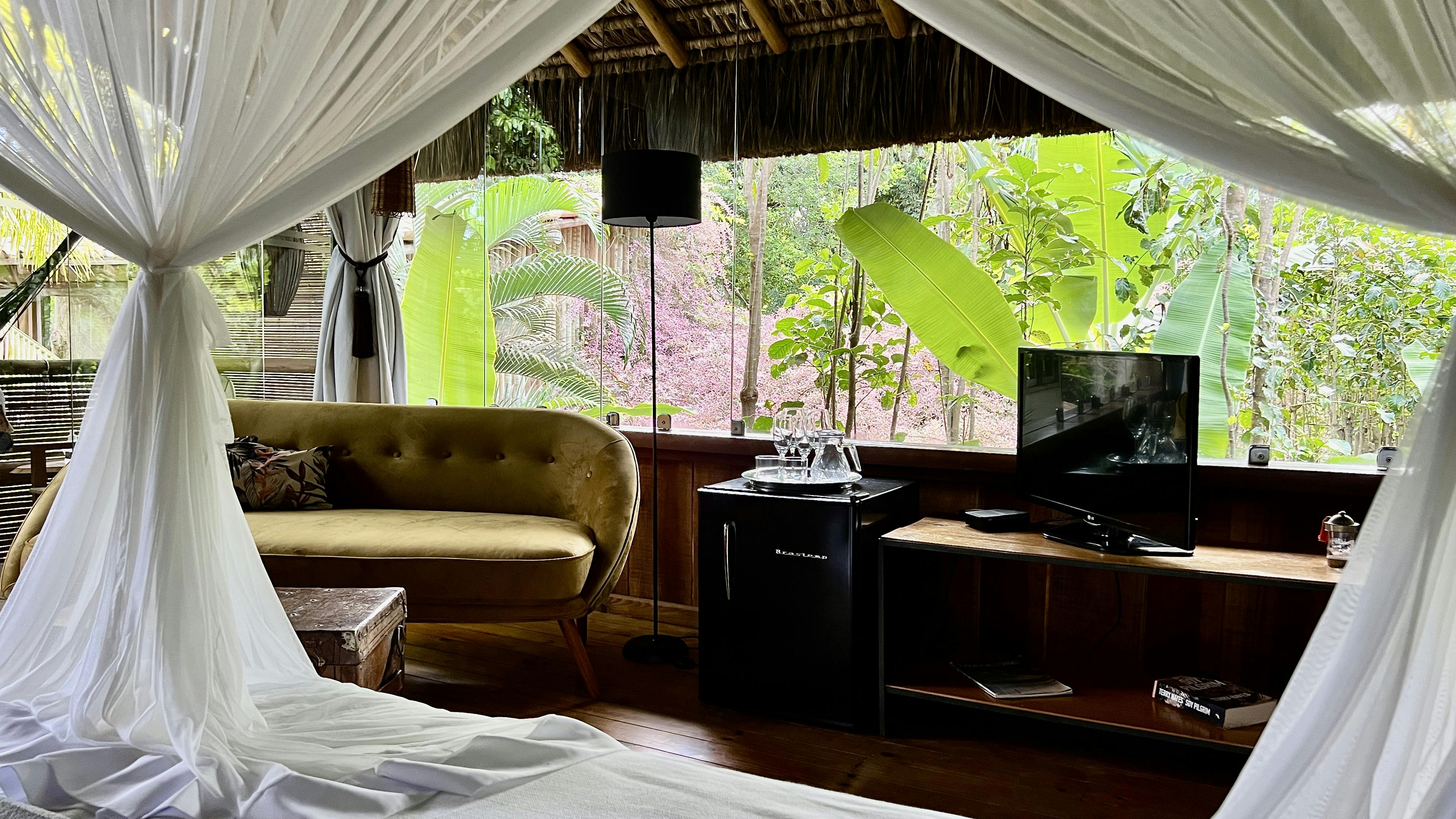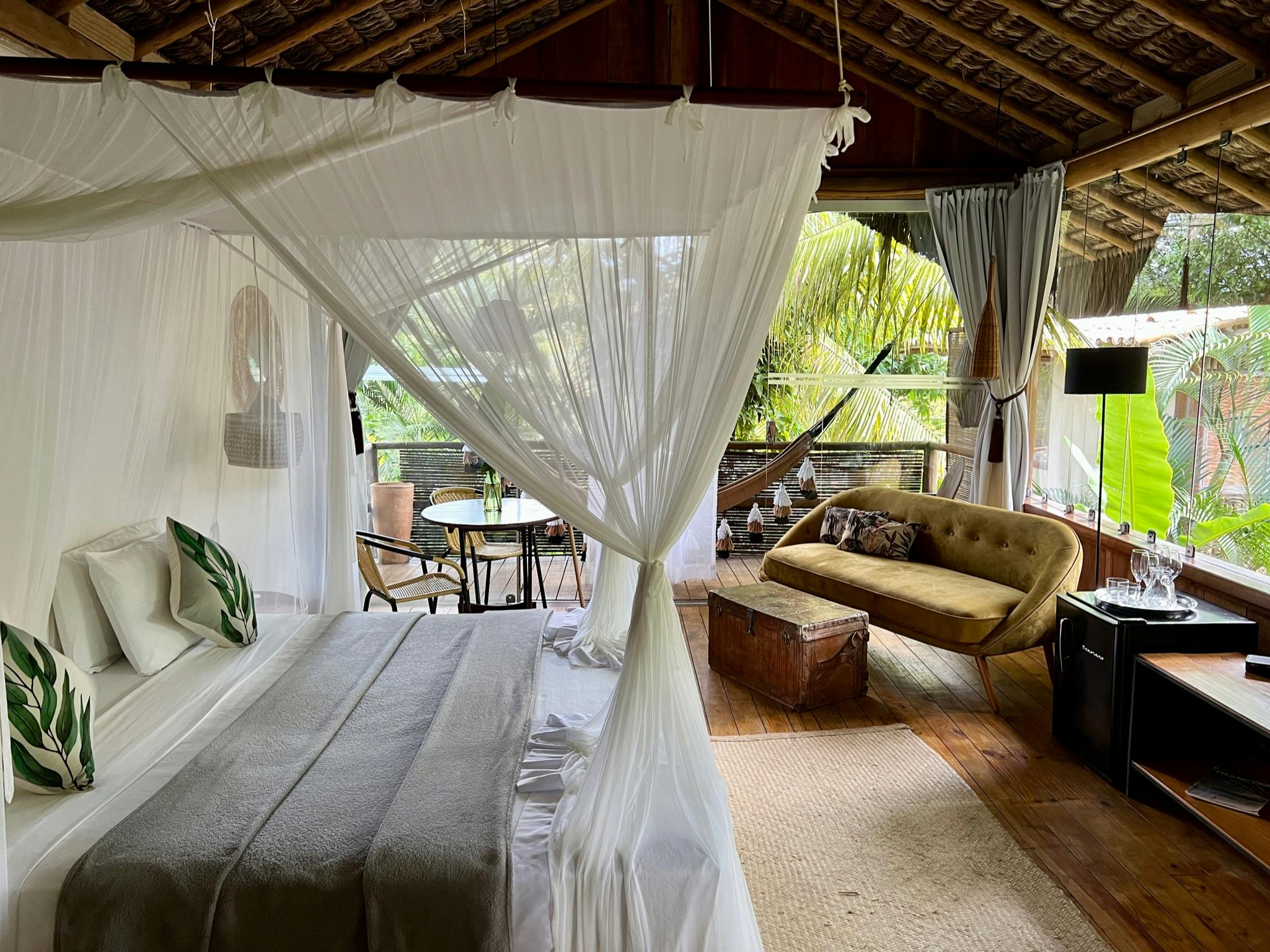 A spacious bangalô, suspended amidst tropical foliage, with rustic essential design.