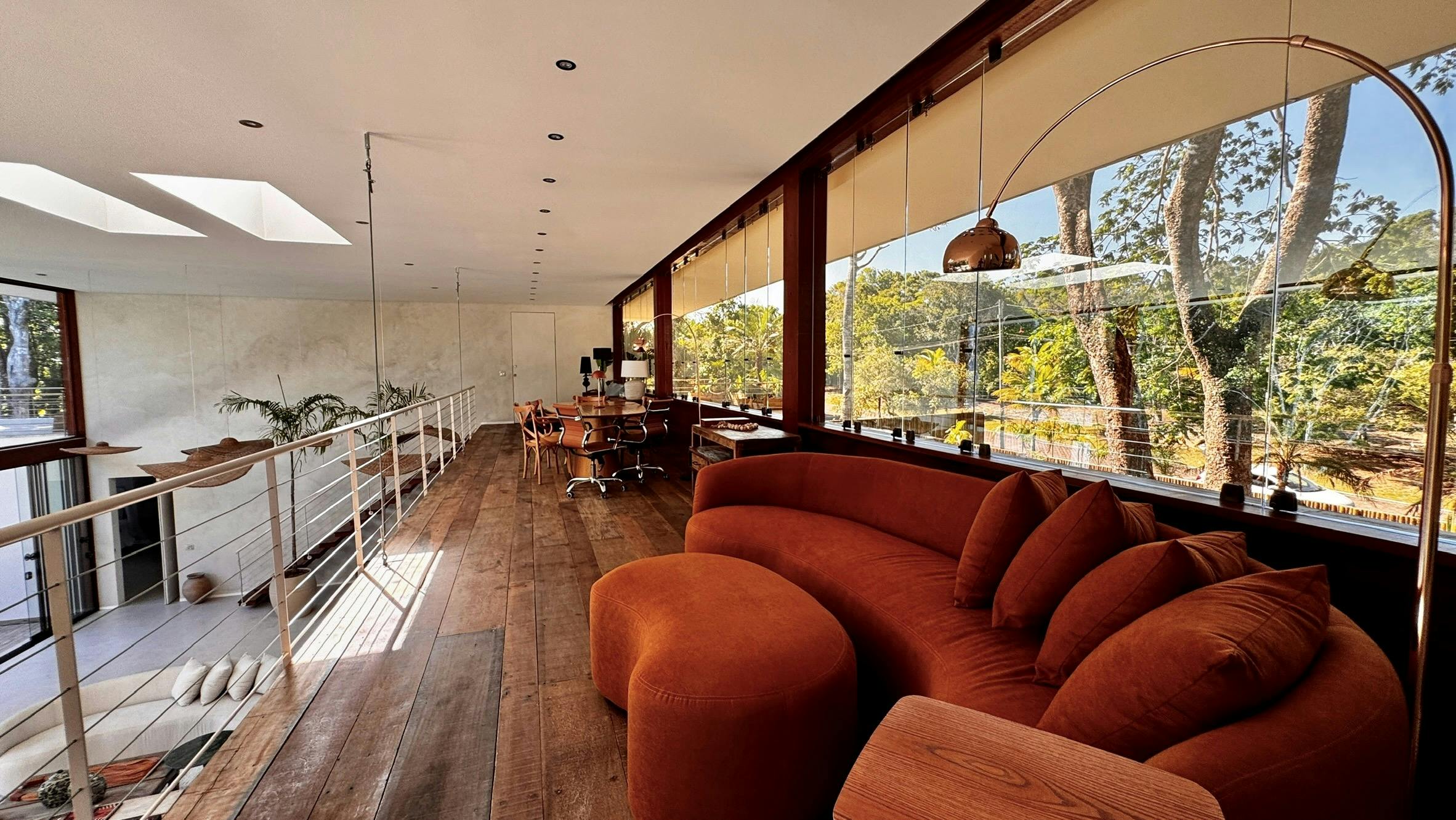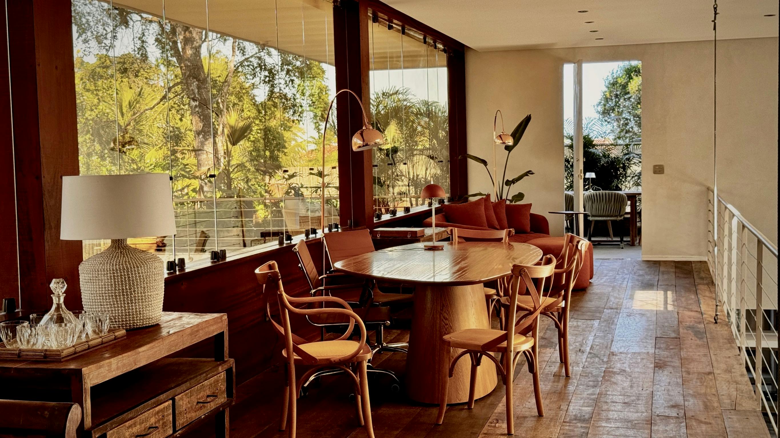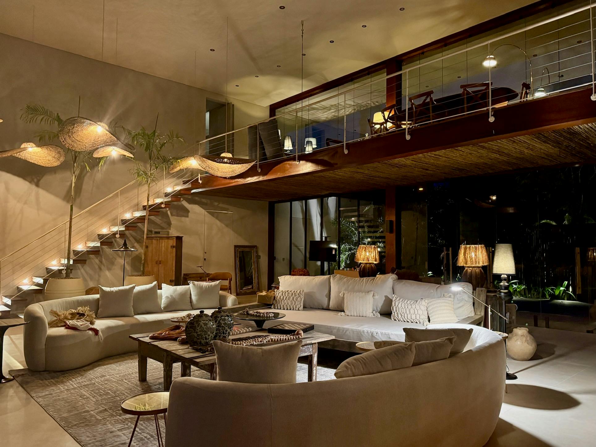A casa revela um grande living com pé-direito duplo, onde o ar e a luz se tornam protagonistas. O design combina rústico sofisticado com minimalismo contemporâneo, criando uma estética sensorial, elegante e naturalmente teatral.