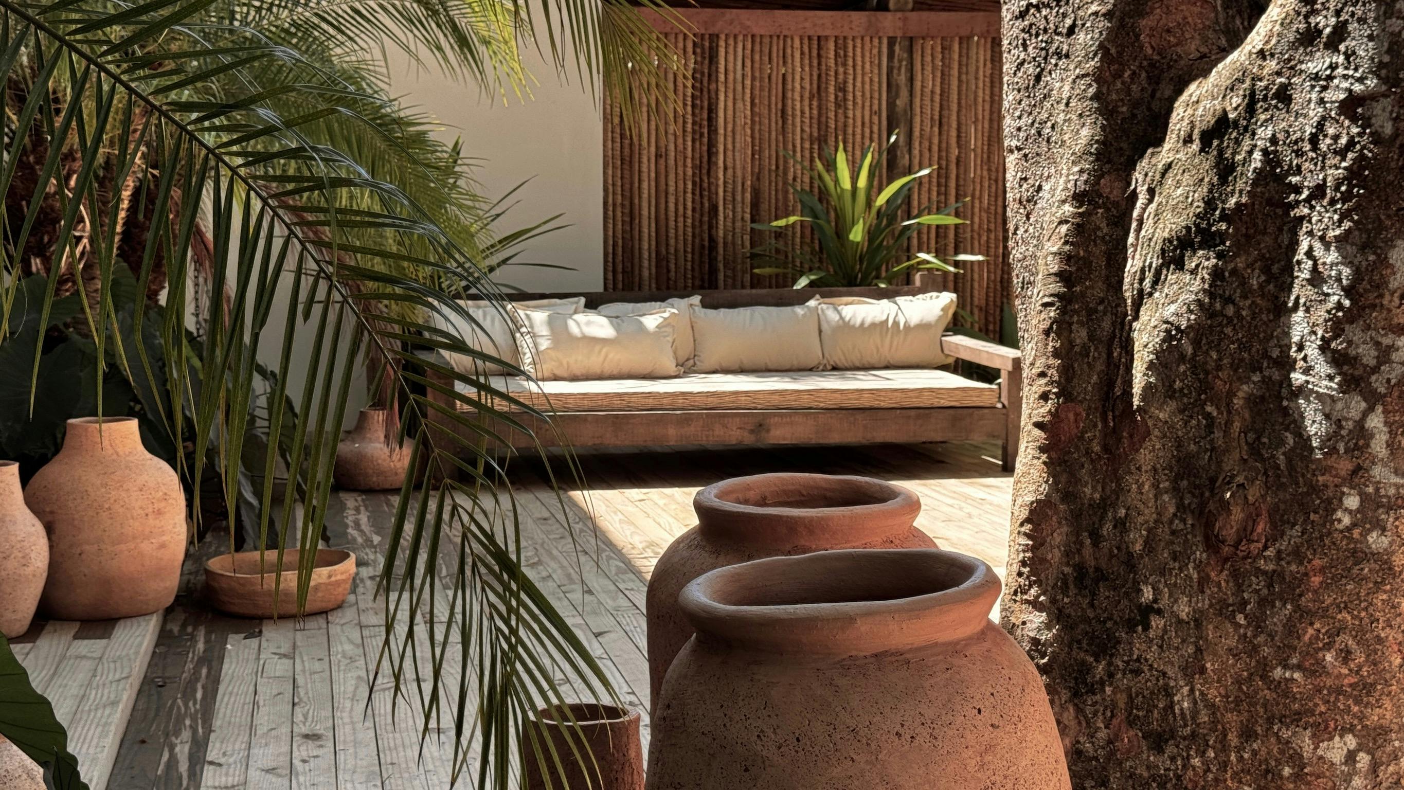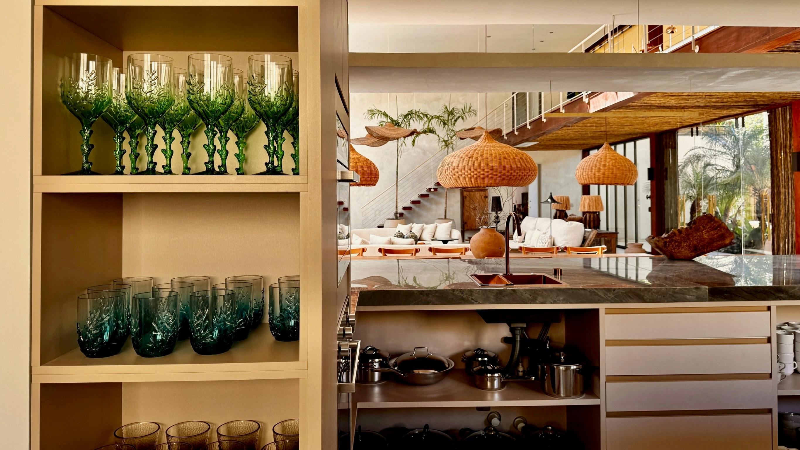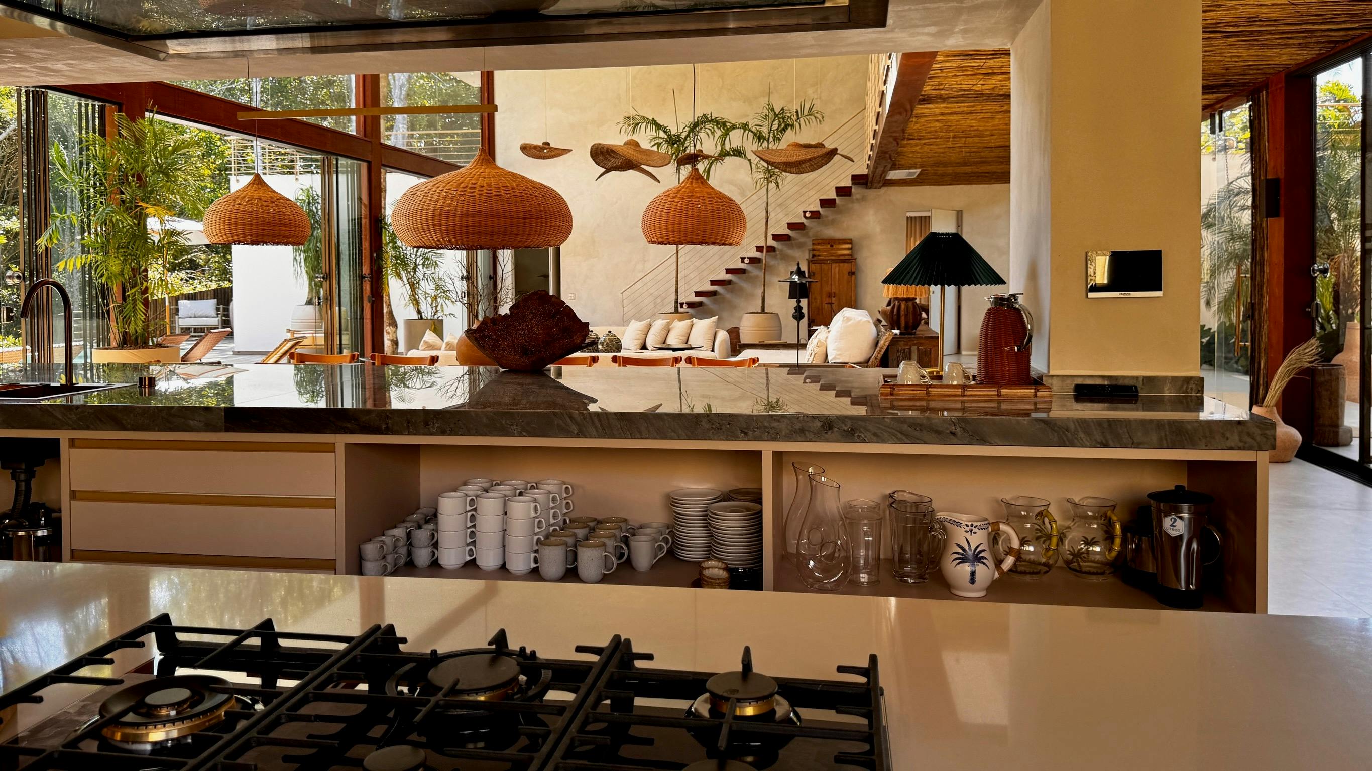 A casa revela um grande living com pé-direito duplo, onde o ar e a luz se tornam protagonistas. O design combina rústico sofisticado com minimalismo contemporâneo, criando uma estética sensorial, elegante e naturalmente teatral.