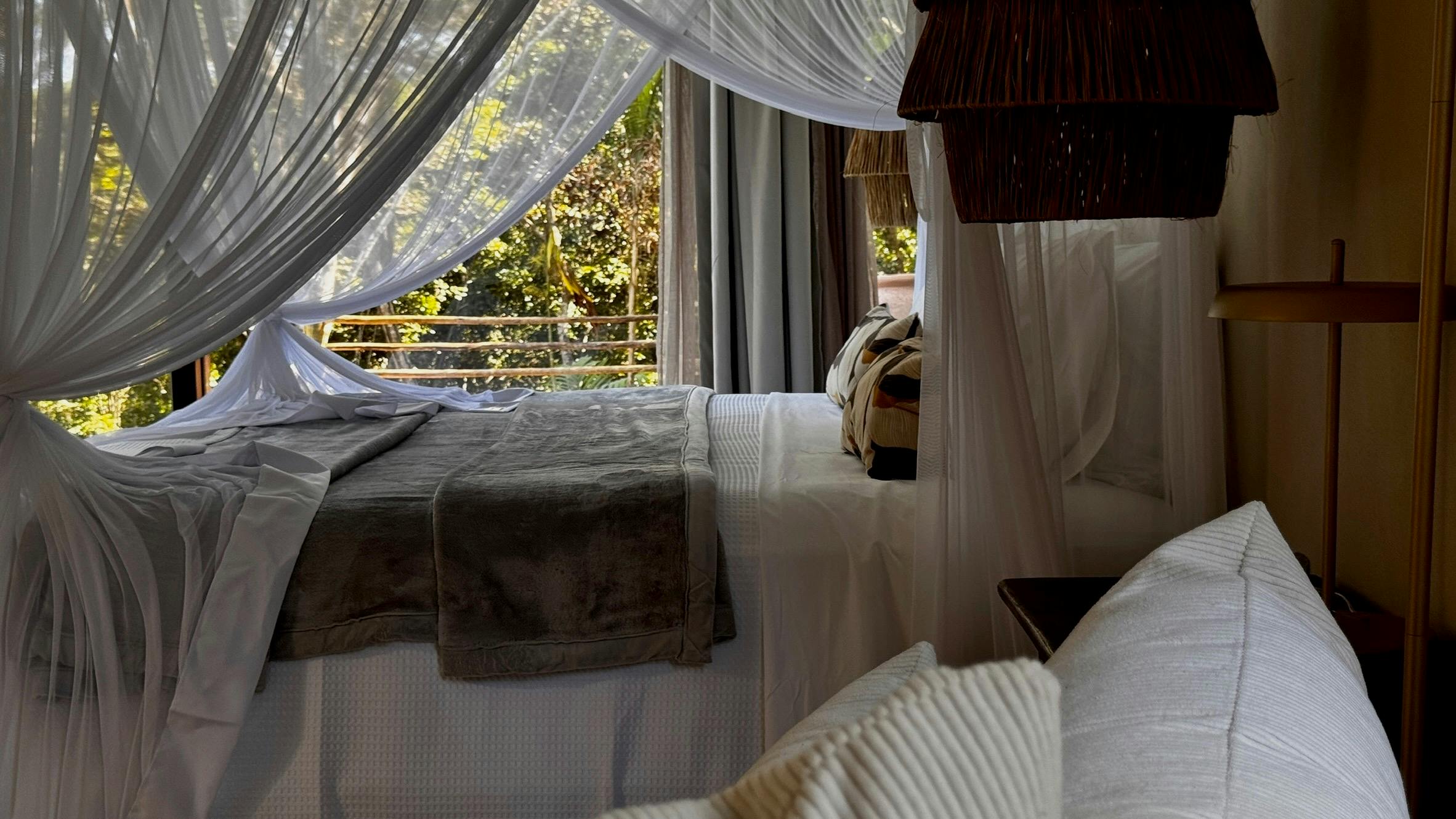 A piscina de 20 m x 3,80 m, com borda infinita, enquadra a mata preservada como um quadro vivo. Possui 8 pontos de hidromassagem, criando um espaço de imersão, relaxamento e contemplação.